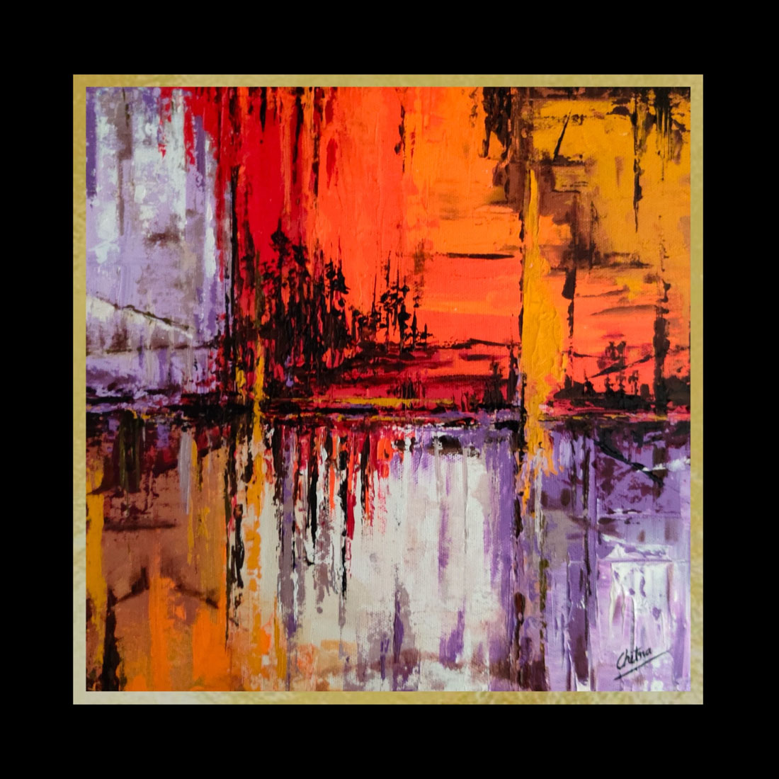 Artist signature present within artwork and painting details provided on the back of canvas sheet.