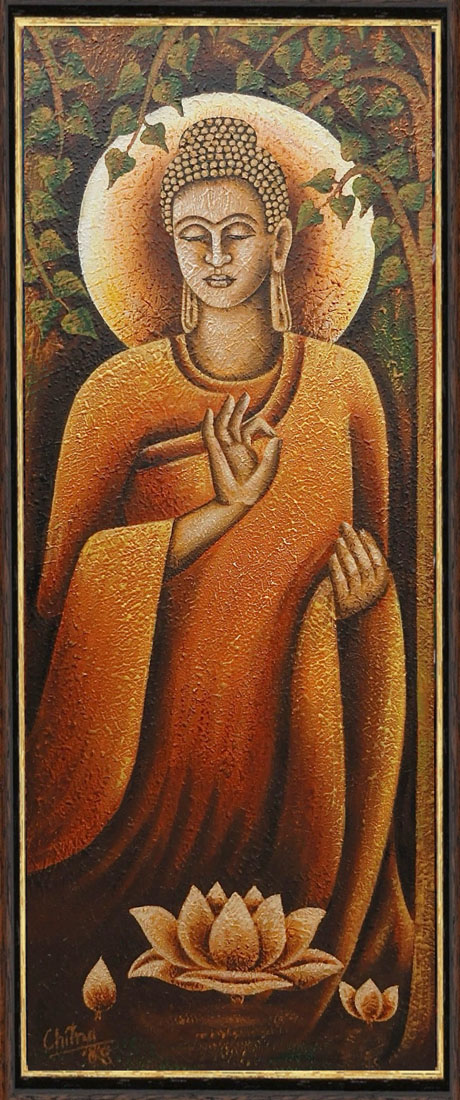 Figurative, Spiritual, Buddha, orange, green, brown, yellow, red, white, acrylic painting, canvas painting