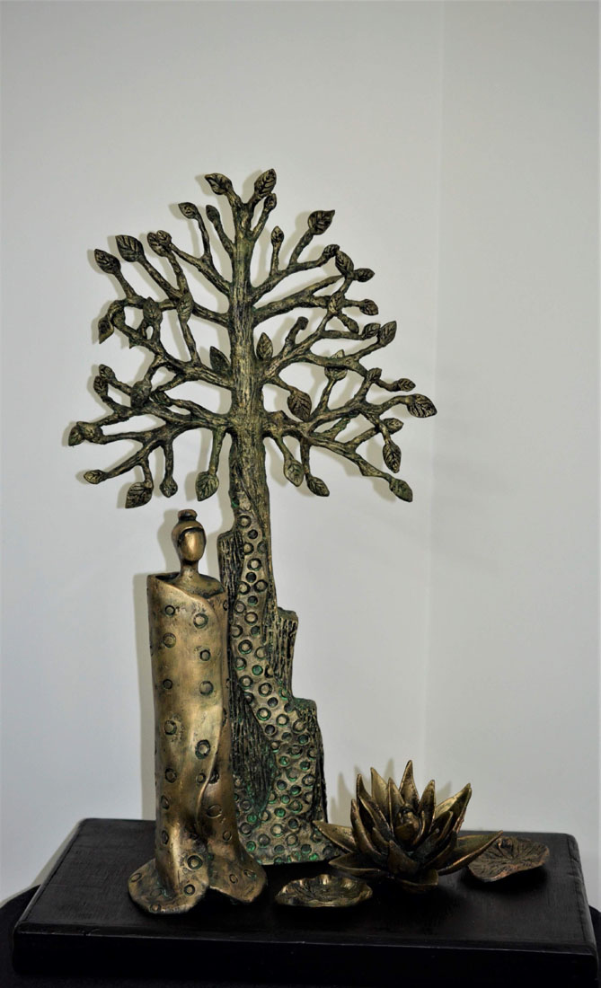 The sculpture depicts a serene Buddha figure standing with a tree, surrounded by a lotus flower and two lotus leaves. The Buddha’s calm demeanour and meditative posture evoke a sense of peace and tranquillity. The tree provides a natural canopy, symbolizing shelter and protection. The lotus flower, often associated with spiritual growth and enlightenment, adds a layer of symbolism to the piece. The sculpture invites the viewer to contemplate the intersection of nature and spirituality.