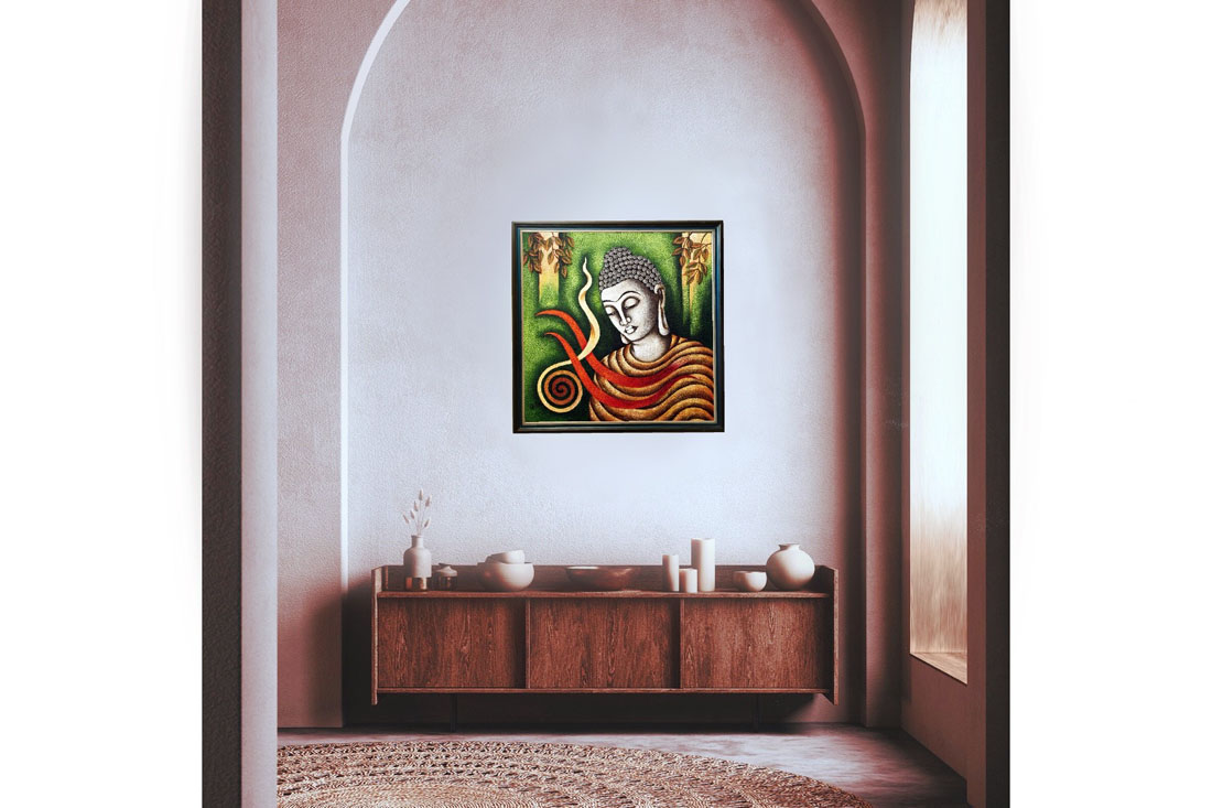 In Buddhism green colour is represents peace, balance, and harmony. Spiral or curved form used to describe a path, or a process in Buddhism.