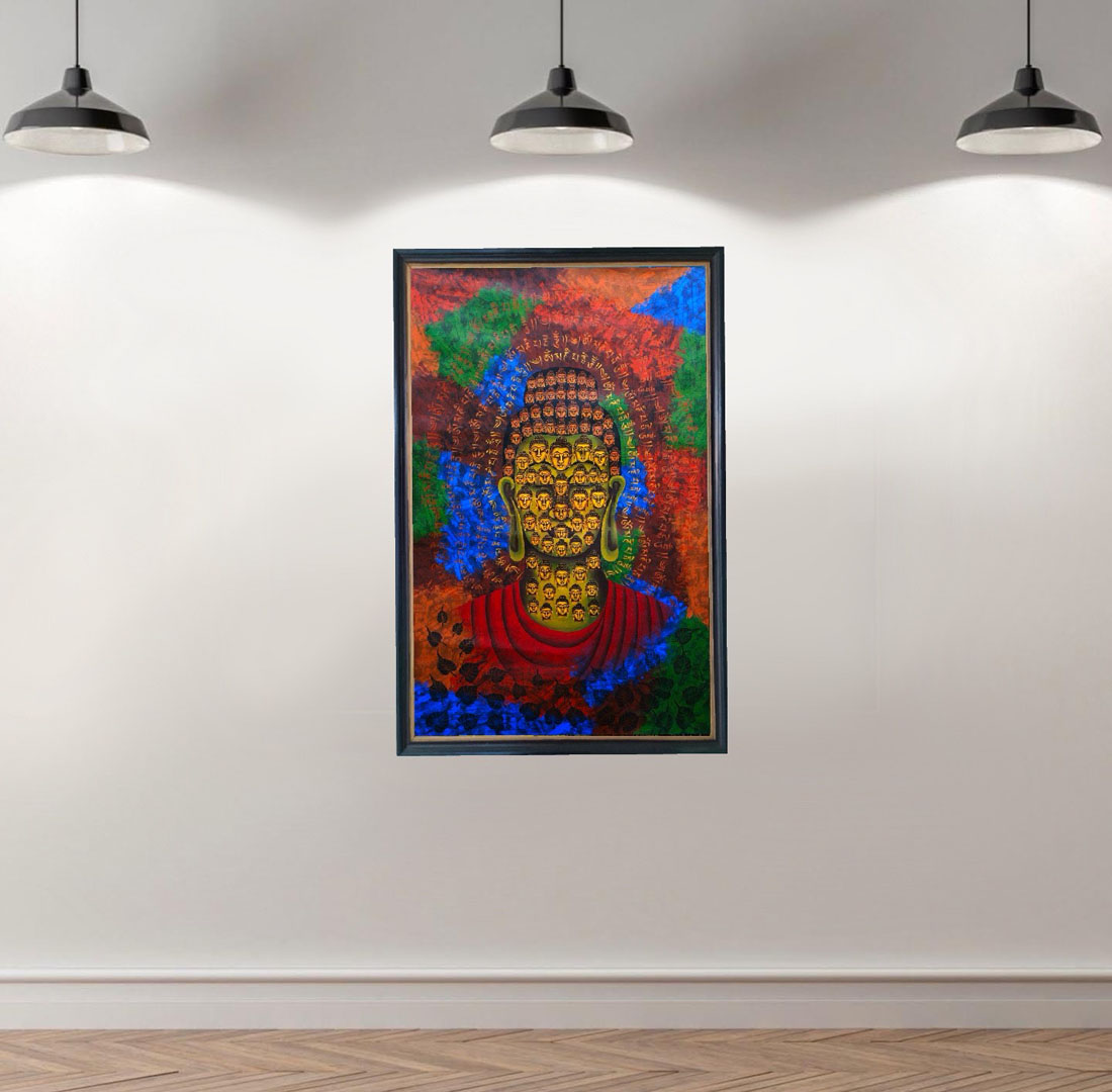 This colourful, yet simple painting can serve both as a focal point or as a complementary piece to your existing decor. Around the faces of Buddha the mantra, “Om Mani padme hum” is painted in Tibetan language. It’s a well-known mantra in Tibetan Buddhism, symbolizing the purification of one’s body, speech, and mind to achieve enlightenment.