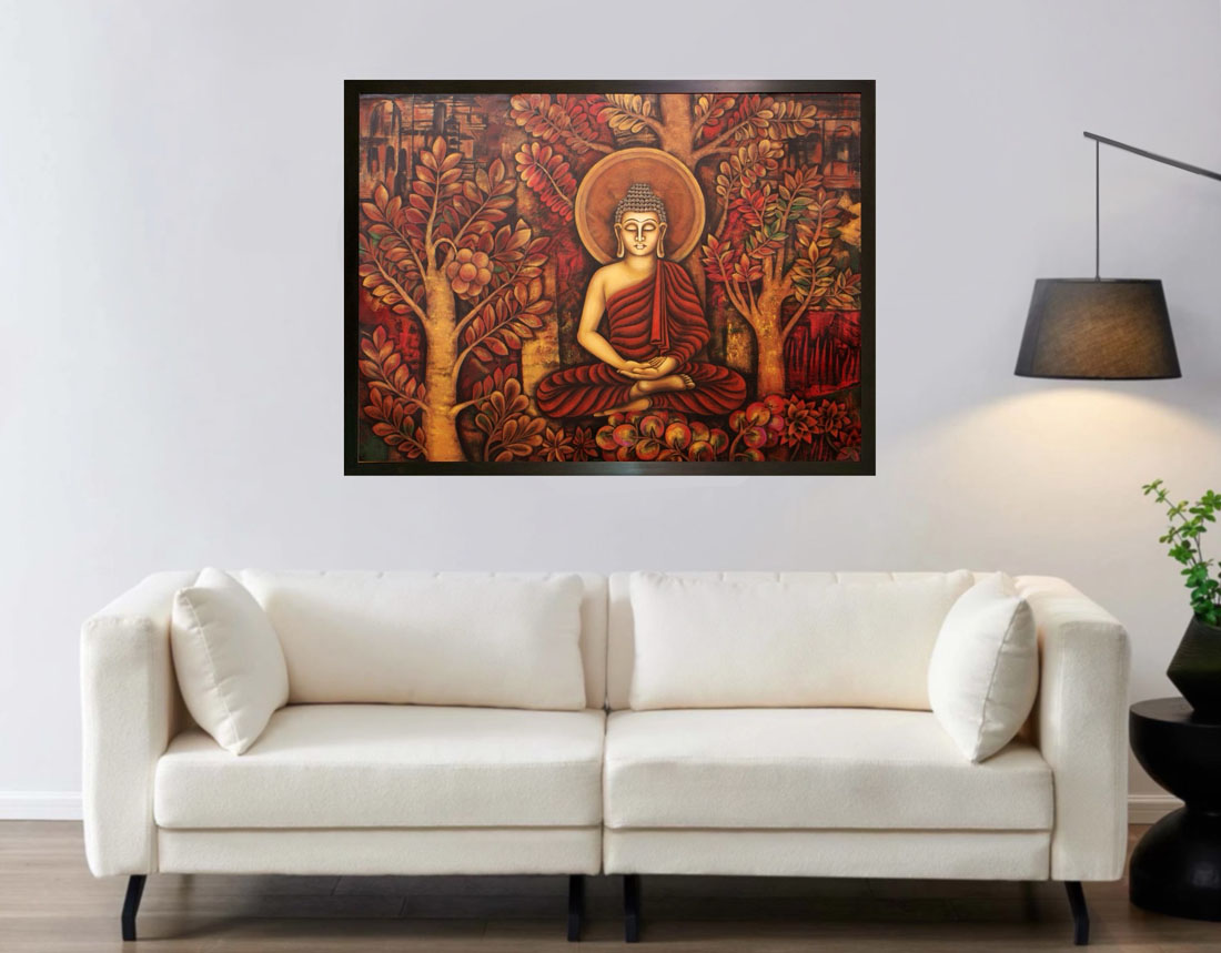 Figurative, Spiritual, Buddha, orange, green, brown, yellow, red, white, Acrylic painting, canvas painting