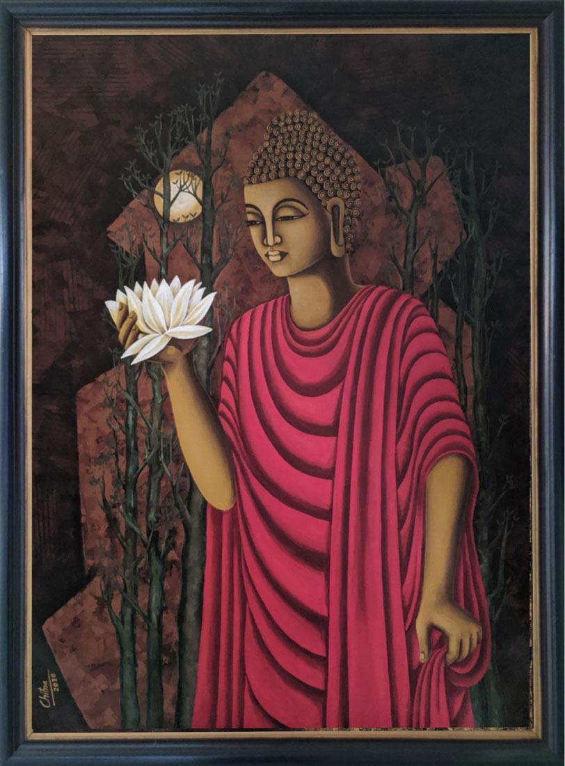 Buddha, brown, white, red, white, lotus, acrylic, canvas