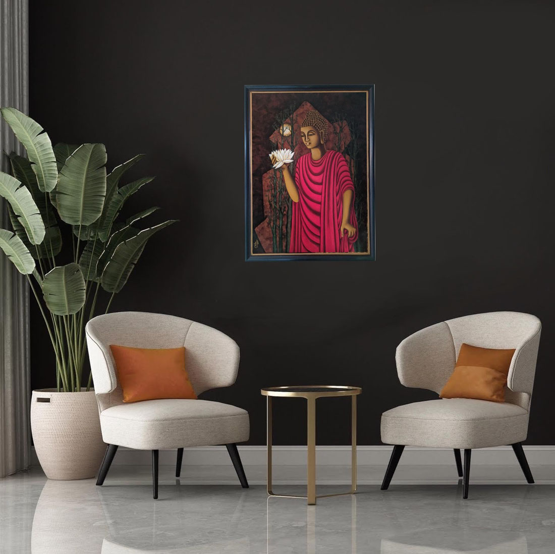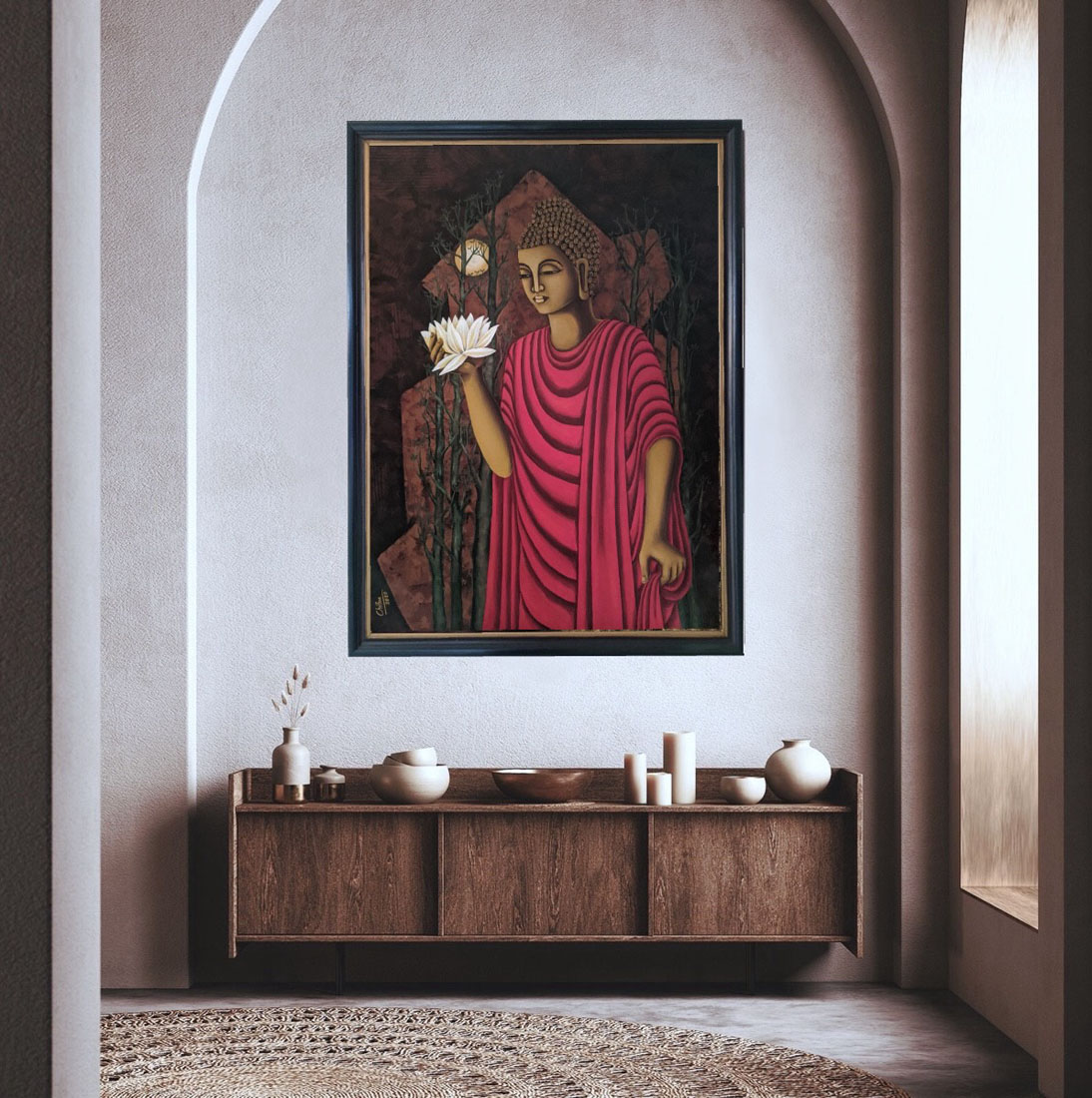 This colourful, yet simple painting can serve both as a focal point or as a complementary piece to your existing decor. In Buddhism, the white lotus flower symbolises a state of spiritual perfection and mental purity, it also associated with Bodhi or being awakened. According to Buddhism, the red colour is transforms the illusion of attachment into the wisdom of discernment. Its transient brown, red and white hue lends itself amicably to both warm and cold tempered surroundings. Painting in warm & cold tones works well in professional and personal settings and may provide an oft needed reminder of Buddhist teachings .