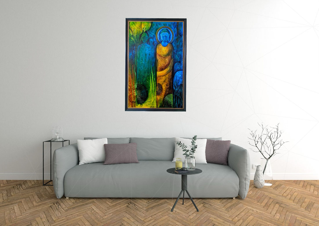 This colourful, yet simple painting can serve both as a focal point or as a complementary piece to your existing decor. In this painting thoughts of the Buddha re-presented through colours. Its transient yellow, blue, brown and green hue lends itself amicably to both warm and cold tempered surroundings. Painting in warm & cold tones works well in professional and personal settings and may provide an oft needed reminder of Buddhist teachings.
