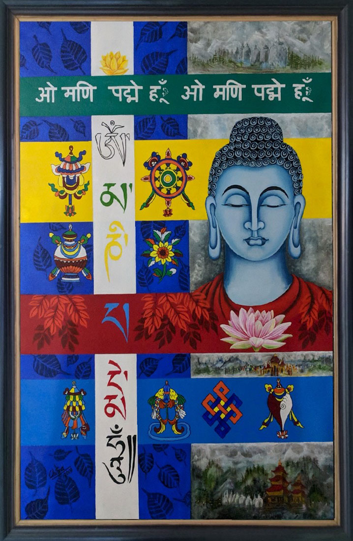 Buddha, lotus, Blue, red, brown, green, yellow ,pink, , Buddhism symbols, Buddhism mantra, acrylic, canvas