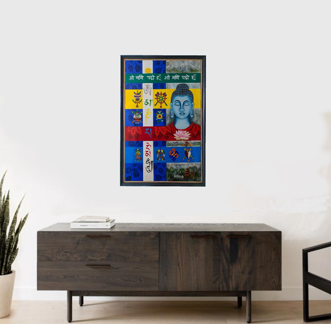 This colourful, yet simple painting can serve both as a focal point or as a complementary piece to your existing decor. In this painting on Lord Buddha and Buddhism’s symbols are painted with a specific color scheme. These symbols represent the teachings of Buddha and are considered as eight auspicious signs in Buddhism. This colourful, yet simple painting can serve both as a focal point or as a complementary piece to your existing decor. Its transient red, orange, yellow, blue, brown, white, pink, and green hue lends itself amicably to both warm and cold tempered surroundings. Painting in warm & cold tones works well in professional and personal settings and may provide an oft needed reminder of Buddhist teachings.