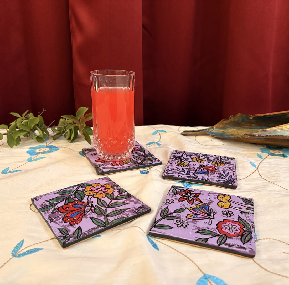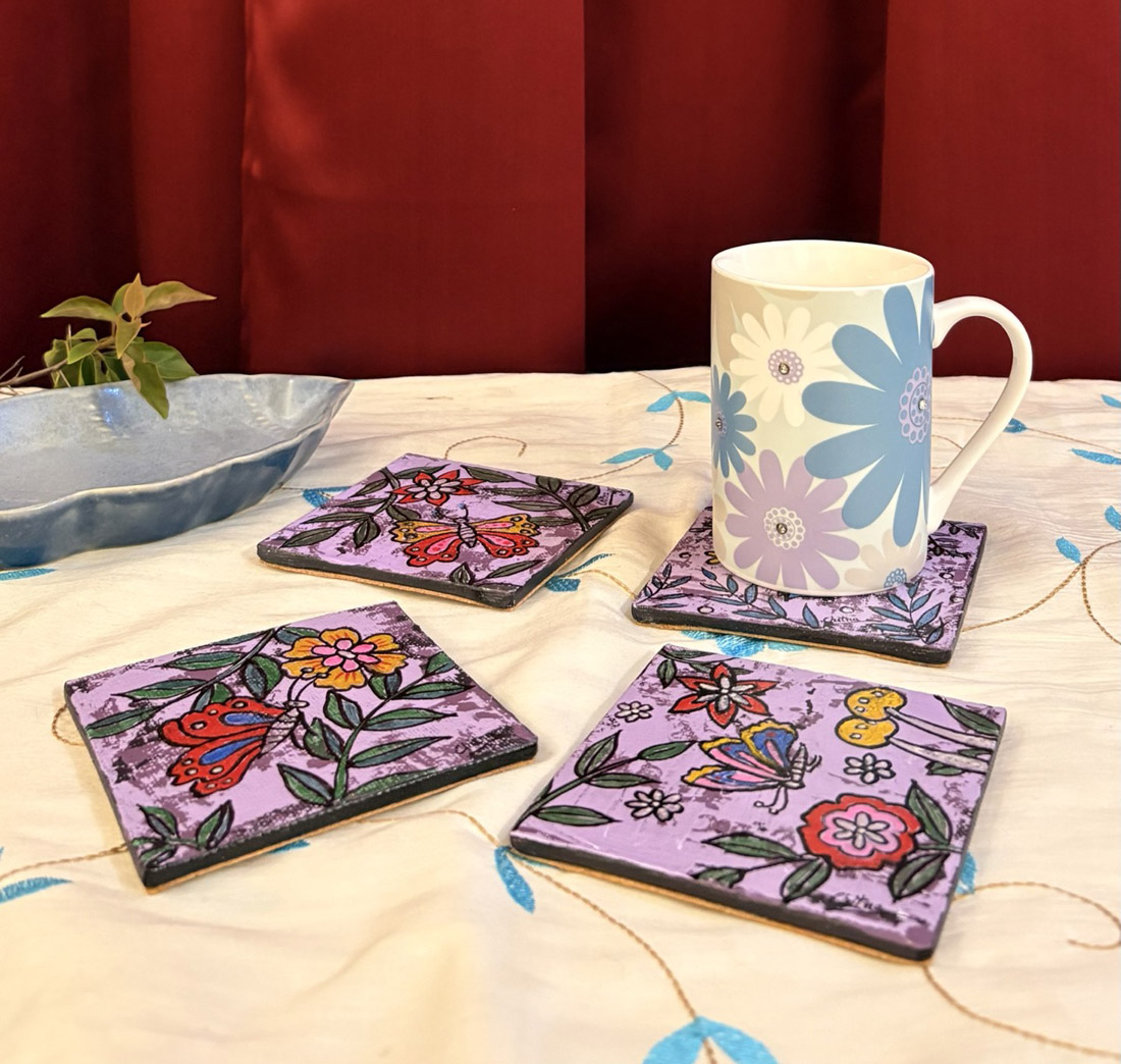 Made of 5 Oz Canvas Fabric & High Quality MDF Board. 1mm thick cork sheet and non-slippery shoes has been pasted on back side, painted by acrylic colour and coated with water resistant medium. These exclusively hand painted and handmade coasters will add an artistic touch to your home or office. These coaster waterproof and useable for both hot and cold beverages in mugs, glasses and even bottles.