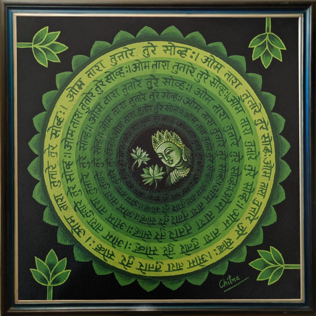 buddhism mantra, green tara mantra, green colour,acrylic, canvas