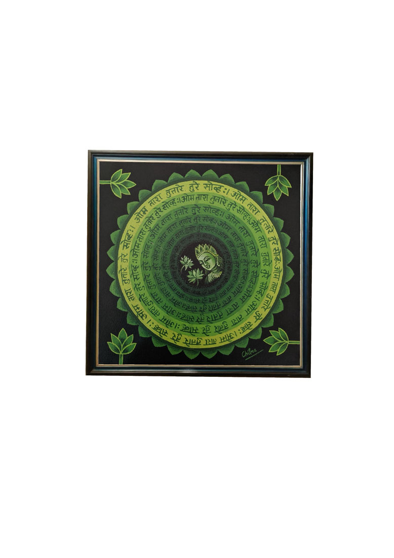 This colourful, yet simple painting can serve both as a focal point or as a complementary piece to your existing decor. The mantra “Om Tare Tuttare Ture Soha” is a mantra from Tibetan Buddhism that honors the goddess Green Tara. It means “I prostrate to the Liberator, Mother of all the Victorious Ones”.
