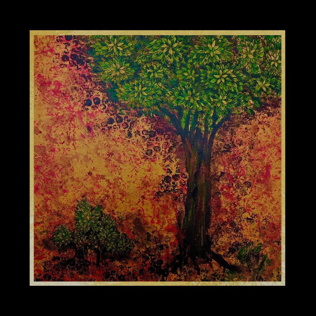 landscape, abstract, green, yellow, red, brown, black, acrylic painting, canvas painting