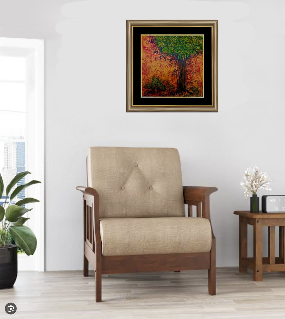 This colourful, yet simple painting can serve both as a focal point or as a complementary piece to your existing decor. This painting is mounted with 2” black paper mount heard sheet with a golden border line. This mount Border is not included in given painting size.
