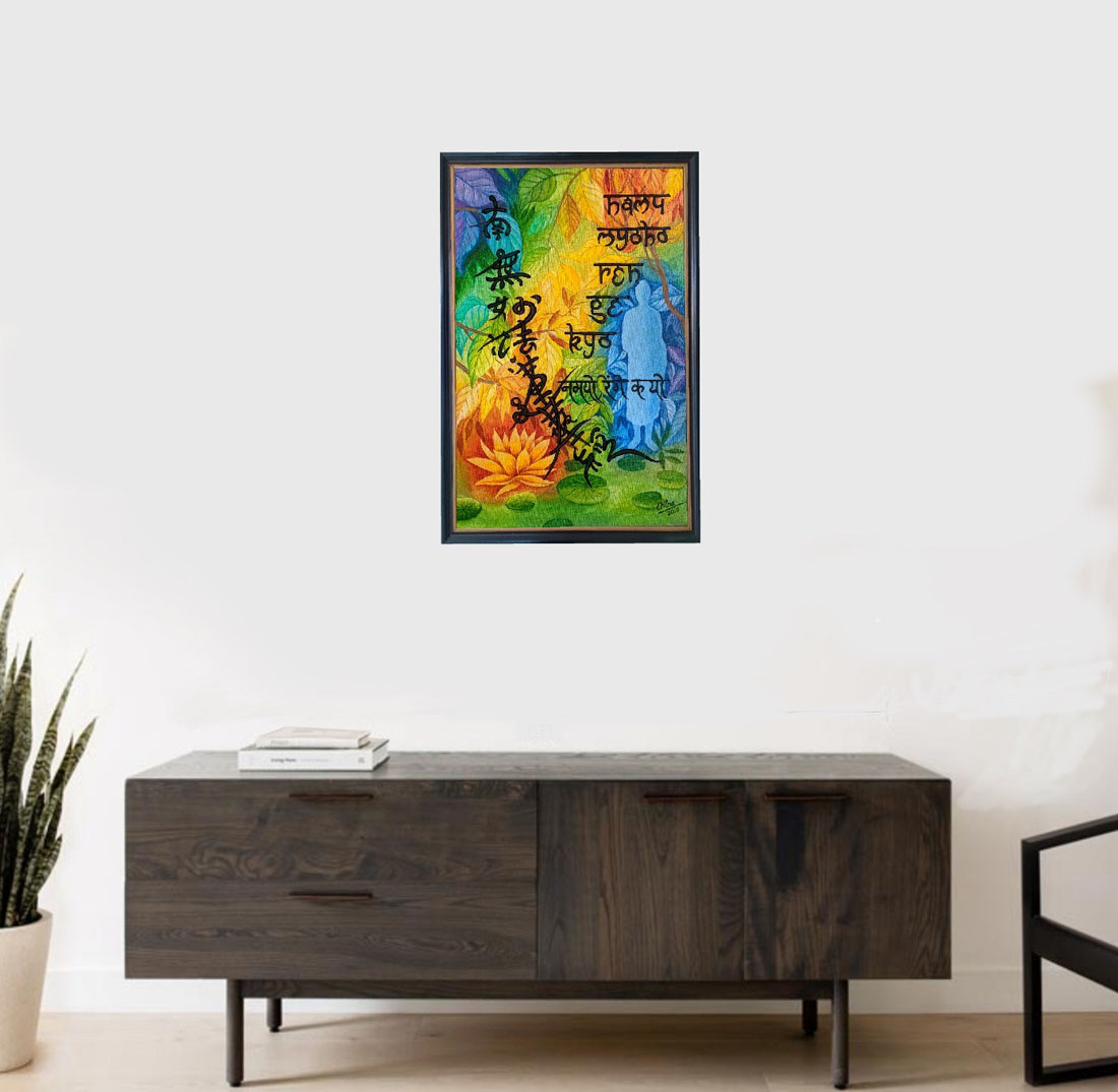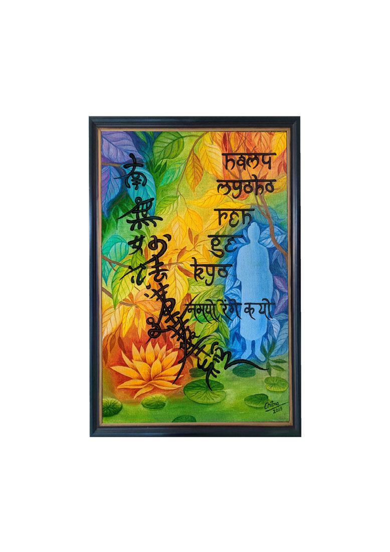 This colourful, yet simple painting can serve both as a focal point or as a complementary piece to your existing decor. Namu-myoho-renge-kyo is a Japanese phrase that means “Devotion to the Mystic Law of the Lotus Sutra”. It is a mantra chanted in Nichiren Buddhism. Nam: Means “to devote” or “dedicate”. It signifies belief in the law.