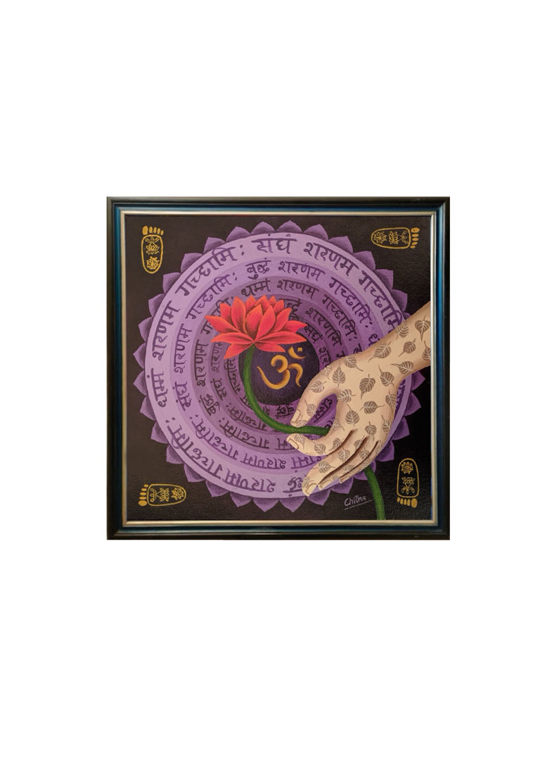 This colourful, yet simple painting can serve both as a focal point or as a complementary piece to your existing decor. The meaning of mantra is “Buddham Sharanam Gachchami I take refuge in Buddha Dharmam Sharanam Gachchami. Dhammam Sharanam Gachchami I take refuge in Dhamma, Sangham Sharanam Gachchami.