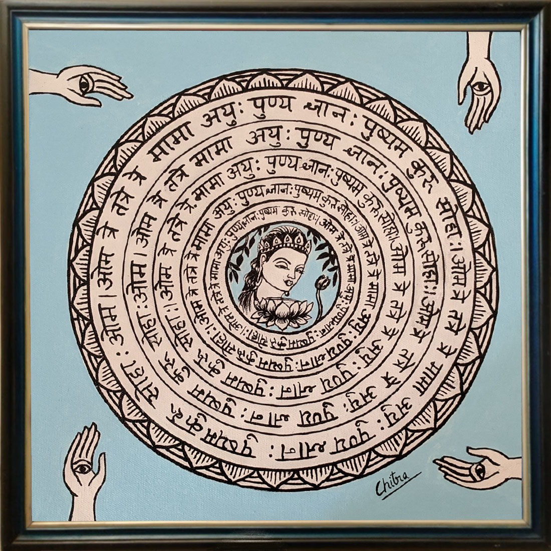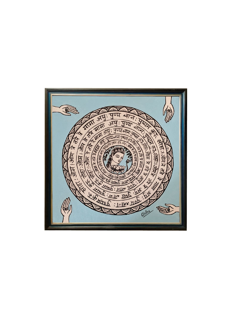 This colourful, yet simple painting can serve both as a focal point or as a complementary piece to your existing decor. The White Tara mantra, “Om Tare Tuttare Ture Mama Ayuh Punya Jnana Pustim Kuru Svaha”, is a Buddhist mantra that invokes the blessings of White Tara. The mantra can be used to request protection, longevity, wisdom, and prosperity.